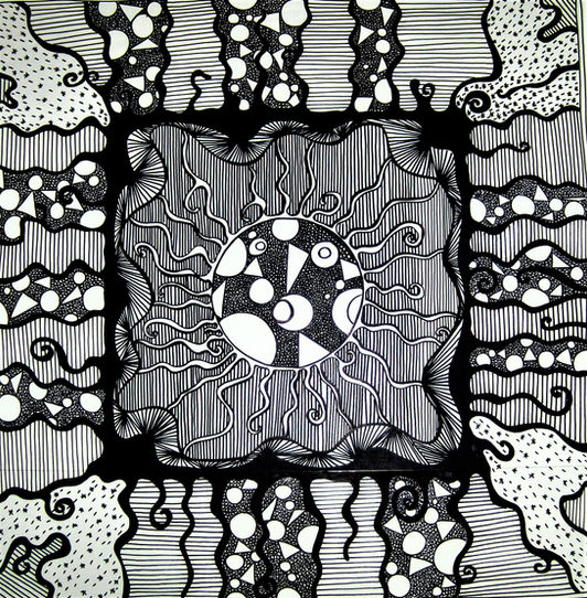 A series of experimental drawings, designs and sketches that form a record of the Sophie's research on colours, black and white and the geometry that guided her early work. It foreshadows her later explorations of depth and substance.